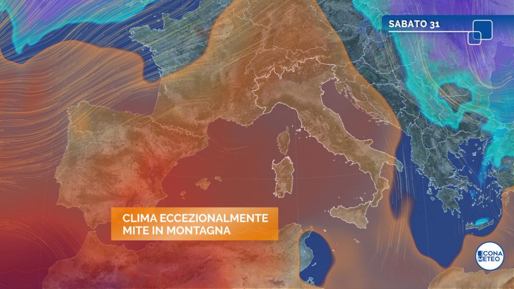 L’alta pressione in rinforzo sull’Europa meridionale favorisce una fase di tempo stabile sull’Italia, soprattutto da domani quando una massa d’aria estremamente mite si propagherà sull’intero territorio, a partite dal Nordovest. Si avranno dunque nel weekend temperature al di sopra della norma, in particolare sui rilievi montuosi del Nord. Le condizioni di tempo diffusamente stabile favoriranno però anche la formazione di nebbie persistenti sulle pianure del Centronord, dove i valori risulteranno più contenuti.