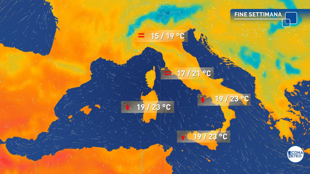 Il weekend e l’inizio di novembre saranno dunque caratterizzati da un rialzo delle temperature su valori al di sopra della norma. Non si faranno registrare temperature molto alte – affermano i meteorologi di iconameteo.it -, ma di 2-3 gradi sopra la media certamente sì. Al Nord non si andrà oltre i 20 gradi, 21 al Centro e 23 al Sud e sulle Isole.