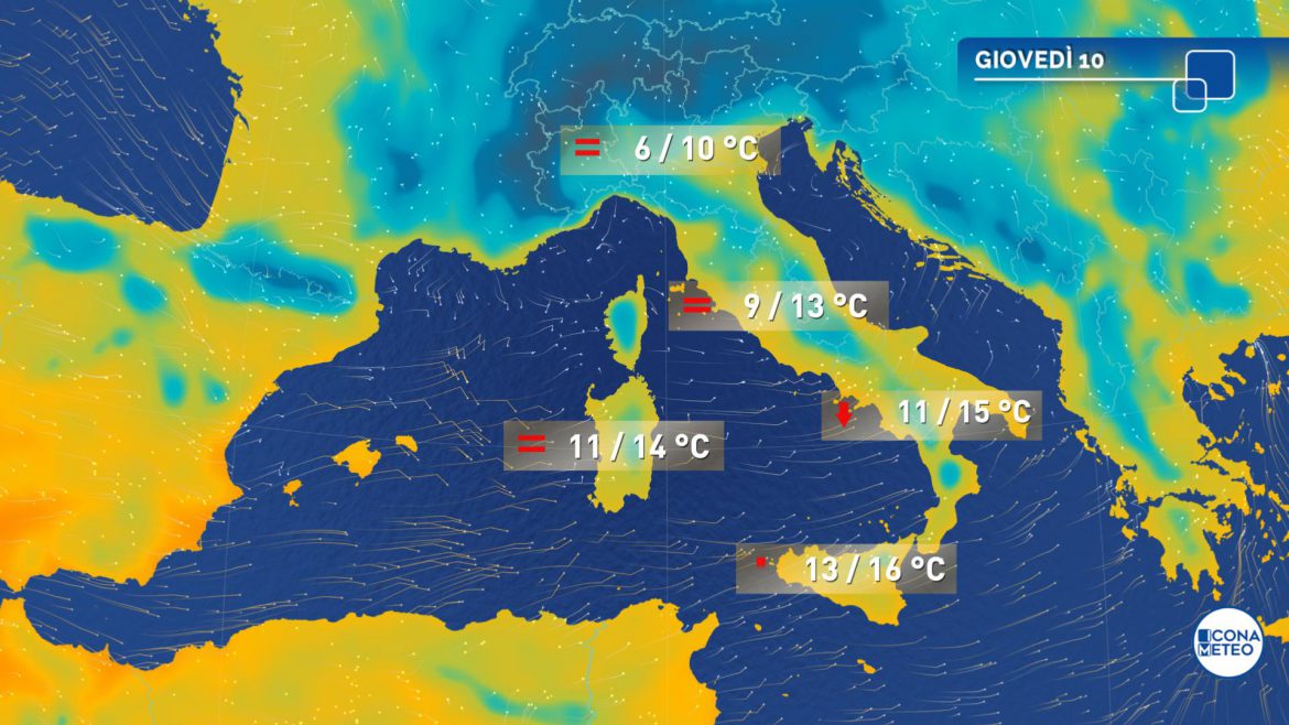 Temperature minime in calo al Centro-Nord, con valori anche leggermente sottozero in pianura al Nord-Ovest e in Emilia. Massime in leggero calo al Nord-Ovest con valori sotto la media; stazionarie intorno alla media altrove. Venti localmente moderati da ovest o sud-ovest intorno alle Isole maggiori e sullo Ionio, in prevalenza deboli altrove. Saranno molto mossi Mare e Canale di Sardegna, basso Tirreno, Canale di Sicilia e Ionio al largo; localmente mossi Ligure occidentale e medio Tirreno; calmi o poco mossi i restanti bacini.