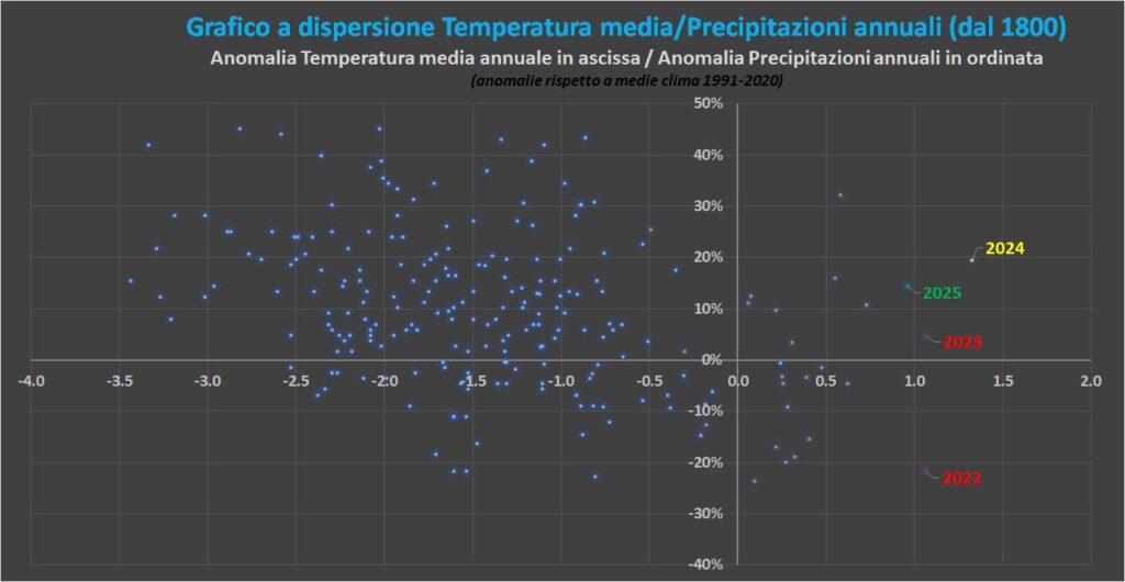 Il 2025 si chiude al 4° posto fra i più caldi della serie storica con un’anomalia di circa +1°C, lievemente sotto i dati del 2022 e 2023 e un po’ più lontana dal record del 2024 (+1.3°C). Come gli ultimi due anni si distingue per l’abbondanza di precipitazioni rispetto alla media (+14%), a differenza del siccitoso 2022: il dato in sé non rappresenta un valore notevole nell’ambito dell’intera serie storica, ma restringendo il periodo agli ultimi decenni si può affermare che si tratta del 6° anno più piovoso degli ultimi 40 anni.