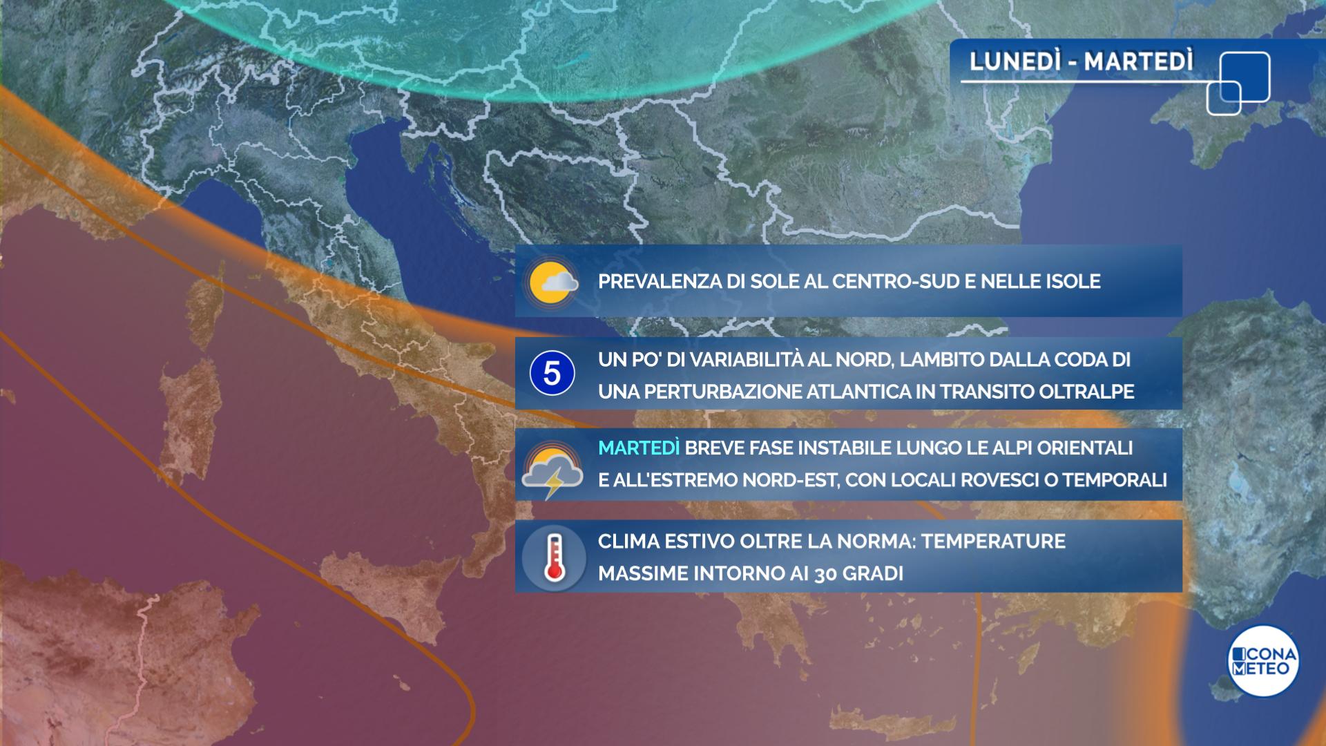 Lunedì si conferma dunque il trend di rialzo termico iniziato nel weekend, con temperature massime che raggiungeranno valori tipicamente estivi. Al Nord, i valori si attesteranno tra i 25°C e i 27°C, mentre al Sud e sulle Isole il caldo sarà più marcato, con picchi di 30°C. Il clima rimarrà gradevole e asciutto, ideale per attività all’aperto e per chi desidera godersi le ultime giornate estive. La tendenza generale vede quindi una giornata all’insegna della stabilità atmosferica e delle temperature elevate su tutta la penisola.