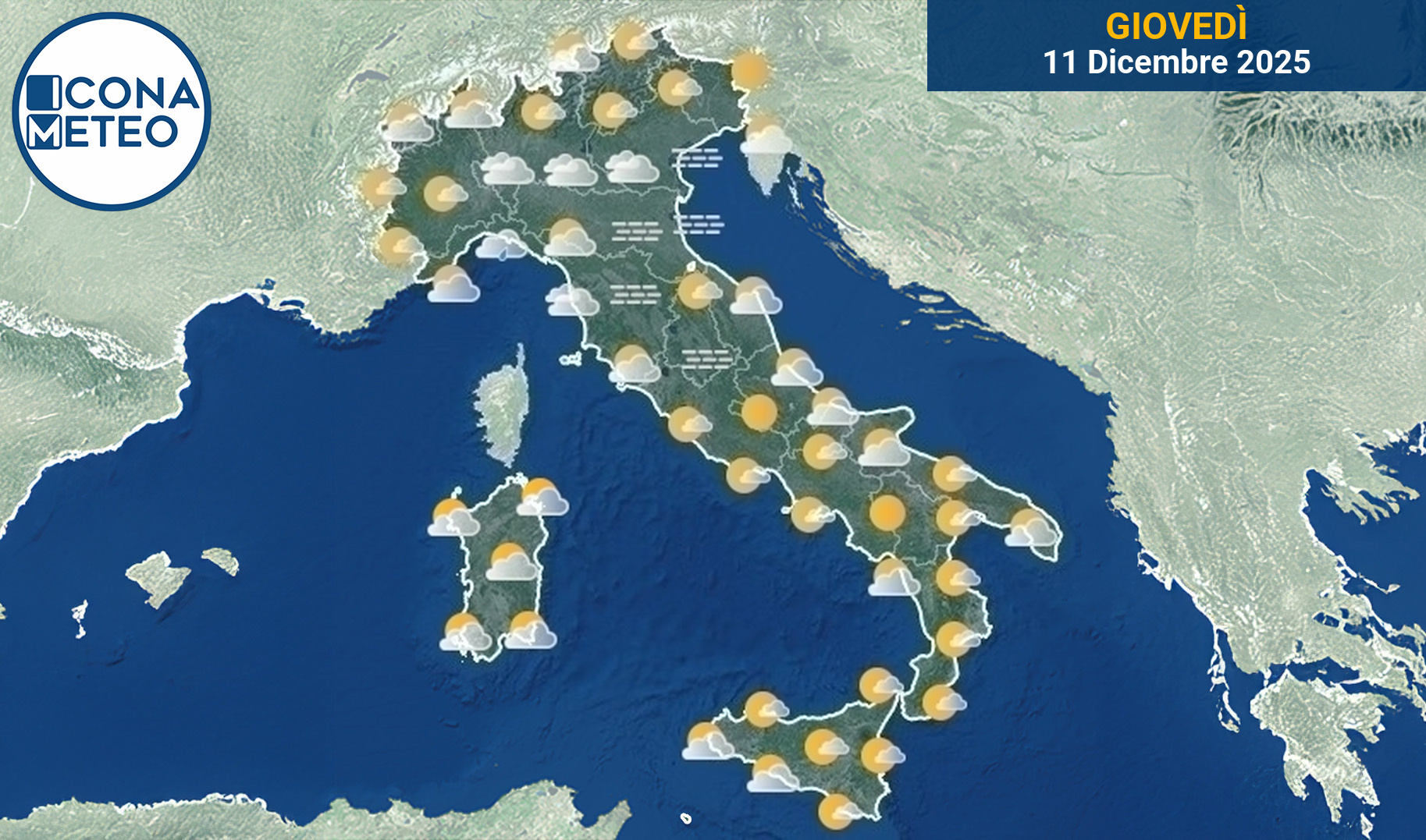 Nebbie e strati nuvolosi bassi in pianura e lungo le coste; più soleggiato altrove. Temperature minime in ulteriore lieve rialzo in pianura.Tempo in prevalenza soleggiato su Alpi, Friuli e Appennino Romagnolo; nelle altre zone nebbie in dissolvimento e nuvolosità in parziale diradamento, ma di nuovo in intensificazione in serata. Temperature massime senza grandi variazioni con valori in gran parte sopra la media. Venti deboli. Mare Adriatico calmo o poco mosso.