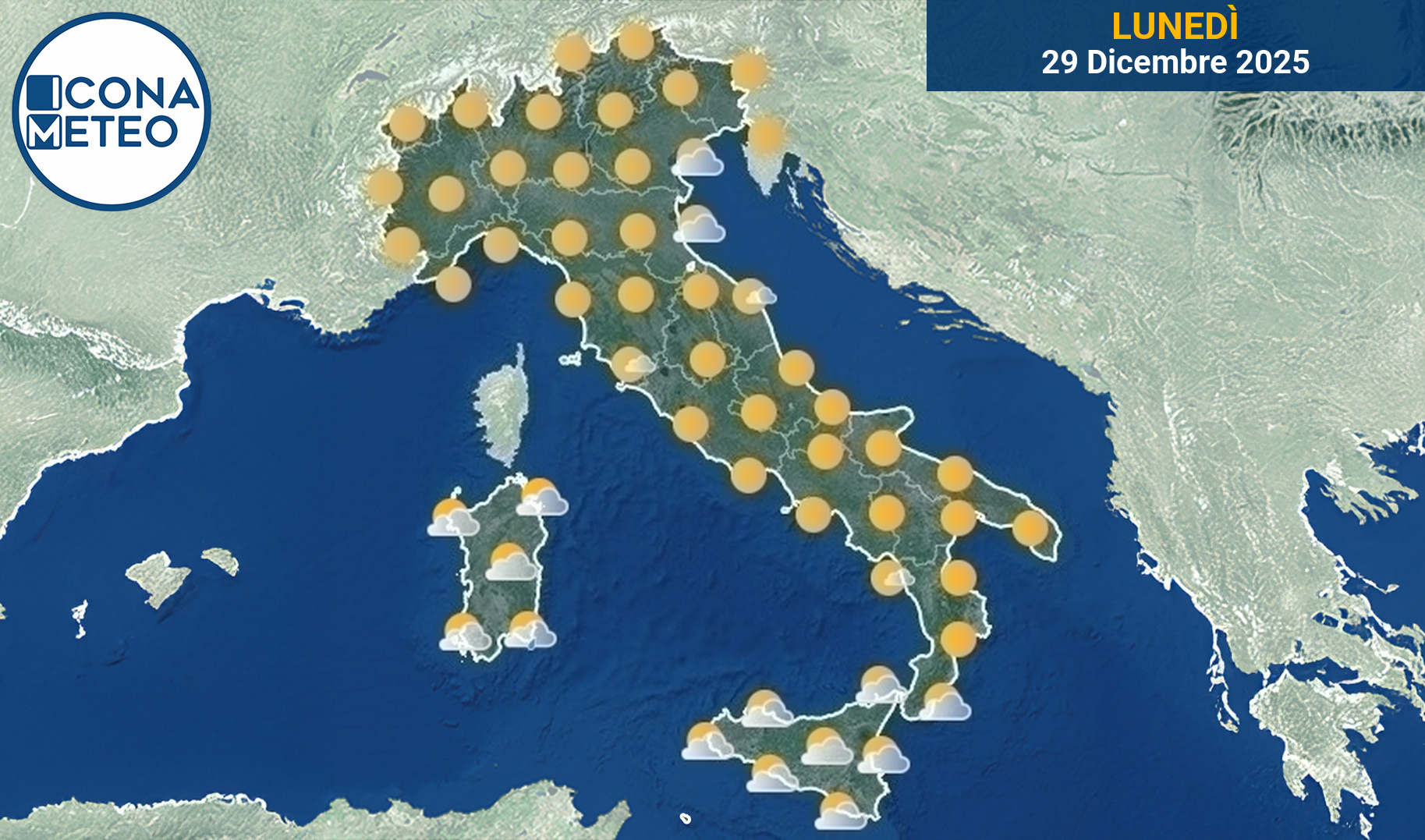 Mattino: Cielo sereno in tutte le regioni, ma con la presenza di nebbie in banchi in pianura su basso Veneto ed Emilia Romagna. Temperature minime quasi invariate, con deboli gelate in pianura.