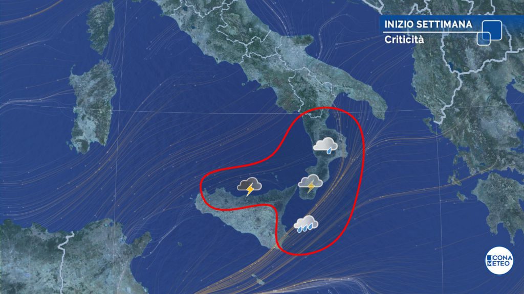 Mentre al Nord le condizioni meteo saranno stabili e in gran parte soleggiate, al Sud dunque proseguirà il maltempo fino a metà della prossima settimana. Le zone maggiormente a rischio di forti piogge o nubifragi saranno la Calabria e la Sicilia, in particolare i settori ionici nelle giornate di lunedì e martedì.