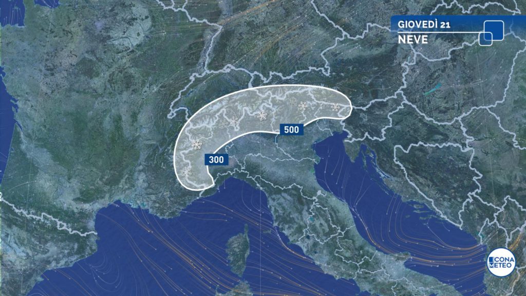 La fase di maltempo, come anticipato, porterà delle nevicate abbondanti sulle Alpi che potrebbero interessare anche alcune zone di bassa collina e di pianura.