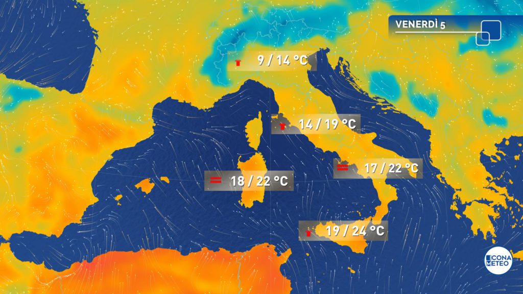 Temperature minime in rialzo, più marcato nelle isole maggiori; massime in ulteriore live aumento, con valori quasi ovunque superiori alla norma e punte di 22/24 gradi al Sud e in Sicilia.