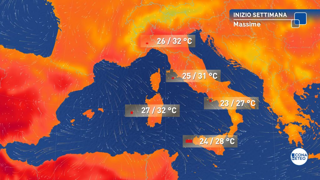 Temperature in leggero aumento al Nord, sulle regioni tirreniche e in Sardegna dove si raggiungeranno punte massime di 27-31 gradi; valori ancora leggermente sotto la media al Sud.