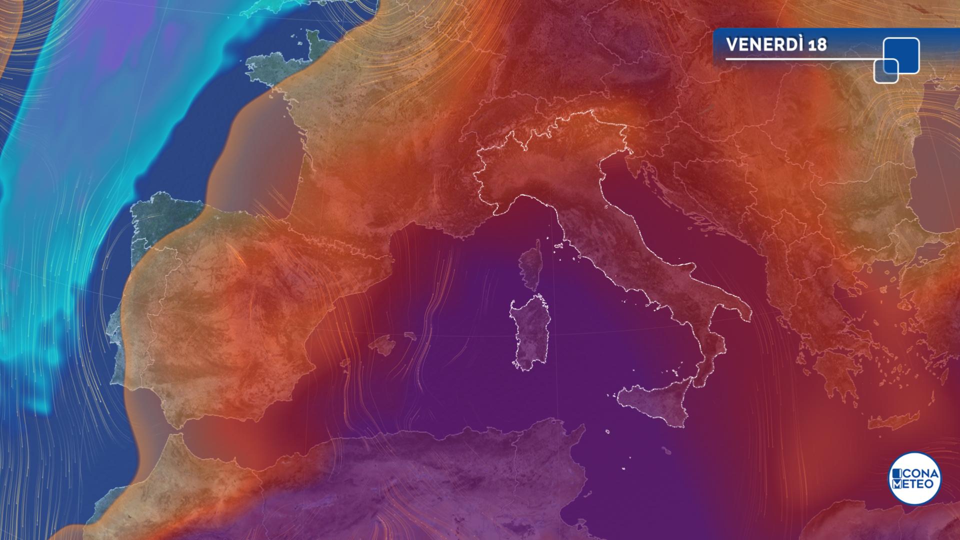 Temperature: stazionarie o in lieve aumento. Clima da piena estate, con valori al di sopra della norma: generalmente intorno ai 29-33 gradi, con punte fino a 34-35 gradi su Sardegna e ovest della Sicilia.