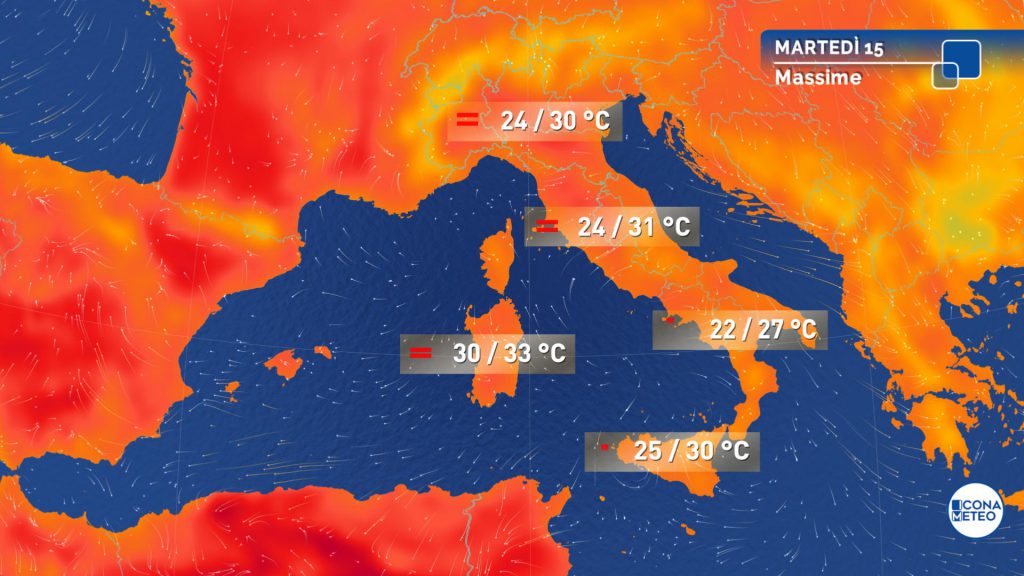 Temperature in generale lieve aumento; valori intorno alle medie stagionali al Sud e in Sicilia con massime pomeridiane per lo più tra 26 e 29 gradi. Clima più caldo al Centro-Nord e in Sardegna con temperature per lo più tra 28 e punte di 32-33 gradi.