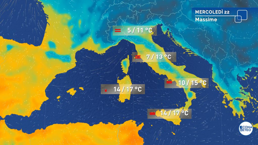 Temperature: massime senza grosse variazioni, al più in lieve rialzo. Valori non oltre i 6-8 gradi al Nord, fino a 15-16 gradi in Sardegna e Sicilia.