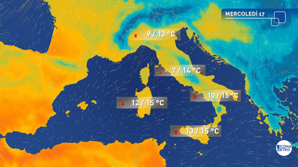 Temperature in ulteriore leggero aumento eccetto le massime al Nord-Ovest che invece subiranno una lieve flessione: valori minimi in generale sopra lo zero, massime nella media o leggermente sopra con punte di 16-17 gradi nelle Isole.