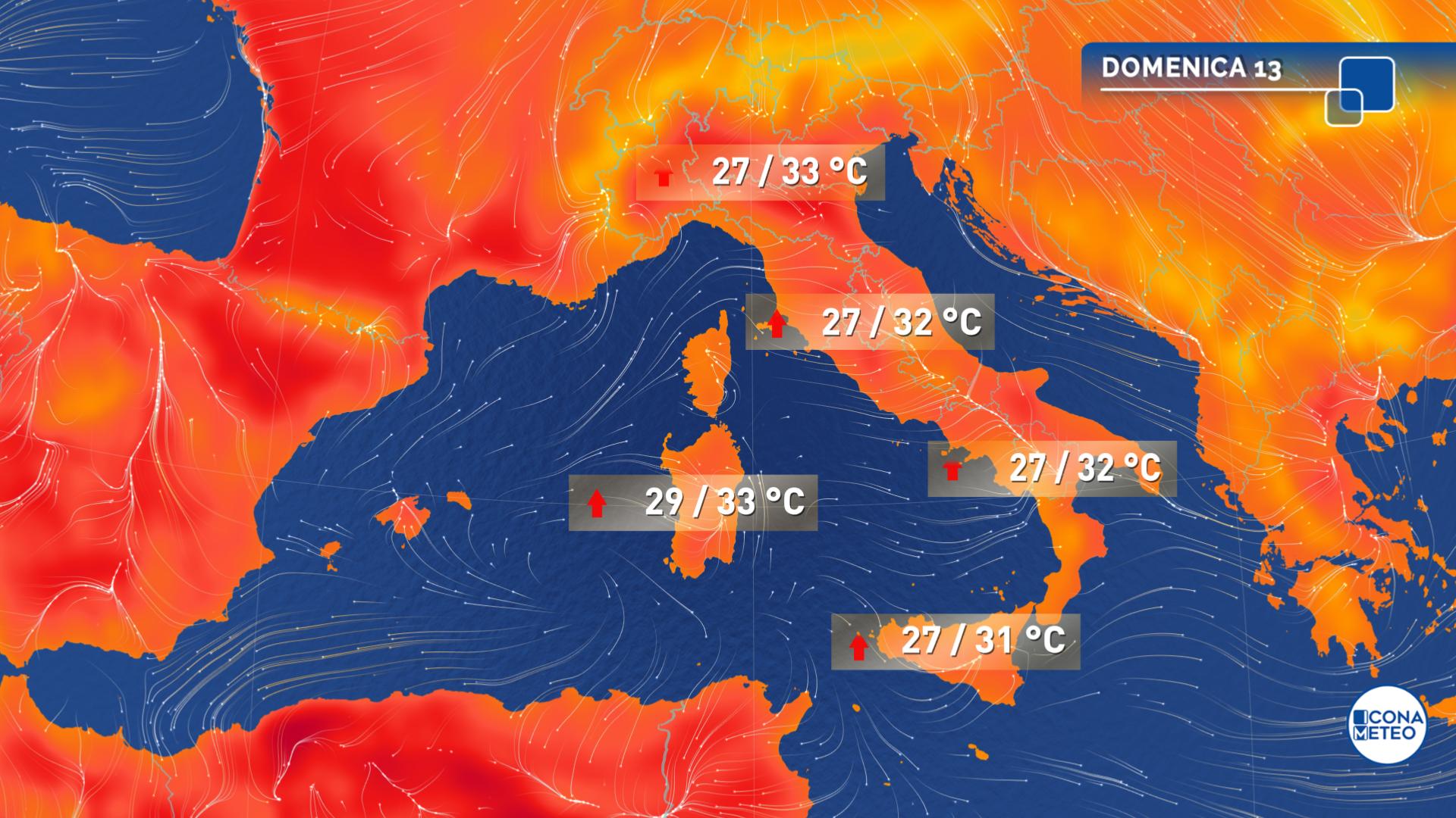 Temperature in generale aumento con un clima molto caldo al Centro-Nord e in Sardegna dove arriveremo a toccare punte di 32-33 gradi, specie nelle aree lontane dalle coste; nelle regioni meridionali valori un po’ più contenuti ma comunque estivi e compresi tra 27 e 30 gradi.