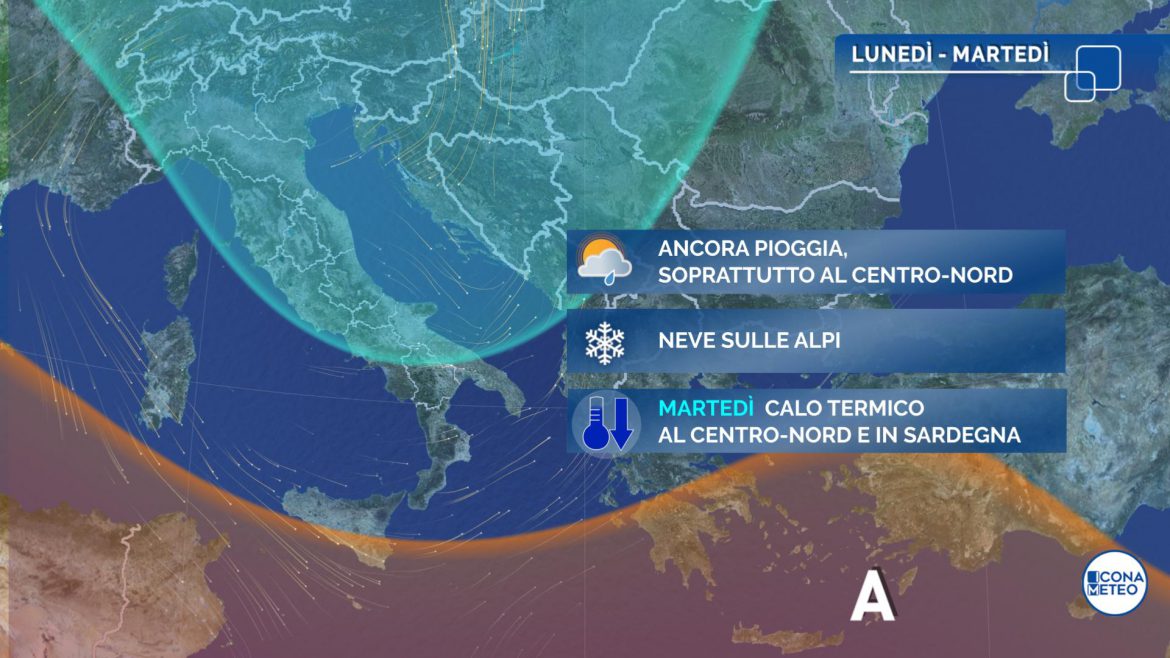 Giornata di maltempo al Nord e nella Toscana nord-occidentale con piogge diffuse, localmente moderate o forti; tra Liguria di Levante e Toscana nord-occidentale possibili temporali; fenomeni più isolati e meno probabili in Romagna ed Emilia centro-orientale. Qualche pioggia anche nel resto della Toscana, in Umbria e Lazio, in intensificazione in serata; da segnalare qualche possibile rovescio sul nord della Sardegna. Sulle Alpi neve inizialmente solo a quote medio alte, il limite delle nevicate si abbasserà nel corso della giornata.