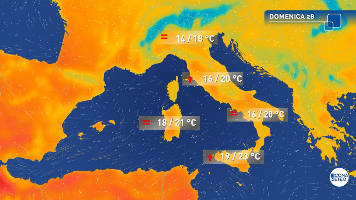 Temperature massime in lieve calo in pianura al Nord, in lieve aumento invece su Alpi, regioni tirreniche e Sicilia; valori fino a 17-18 gradi al Nord e lungo l’Adriatico, fino 20-22 gradi altrove.