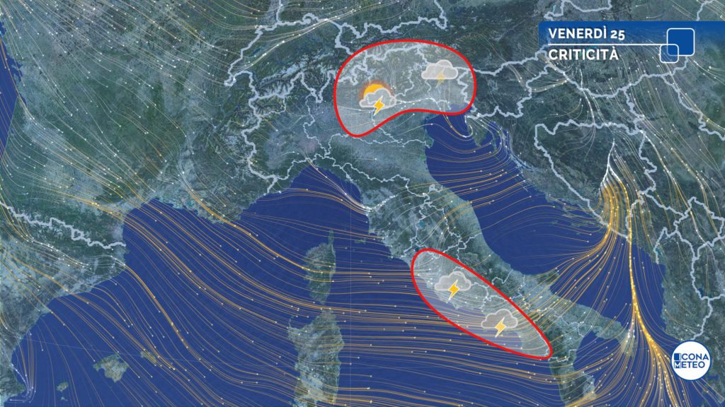 Molte nuvole altrove accompagnate da piogge e locali temporali al mattino principalmente sul versante del medio e basso Tirreno e sulla Sardegna occidentale, nel pomeriggio anche sull’Abruzzo, il Molise e la Puglia. Nel frattempo le schiarite si estenderanno al Nord, alla Toscana Sardegna orientale e su della Sicilia.