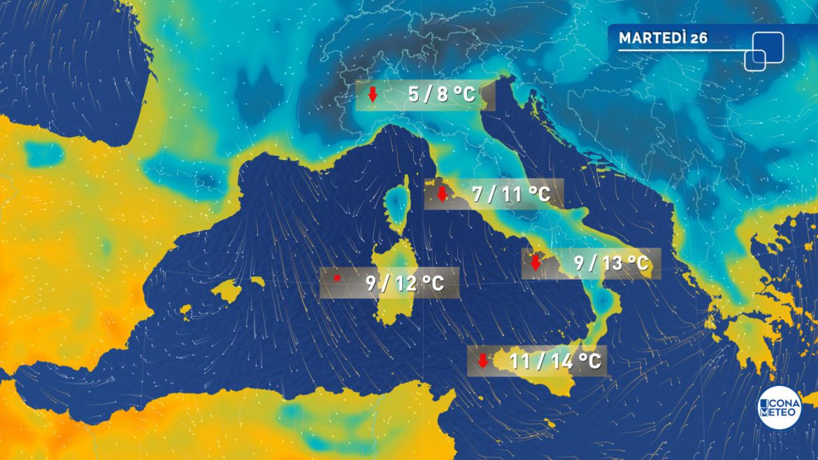 Meteo per domani, martedì 26 gennaio: tempo variabile al Centro-Sud; venti forti al Sud e nelle Isole, con temperature in calo