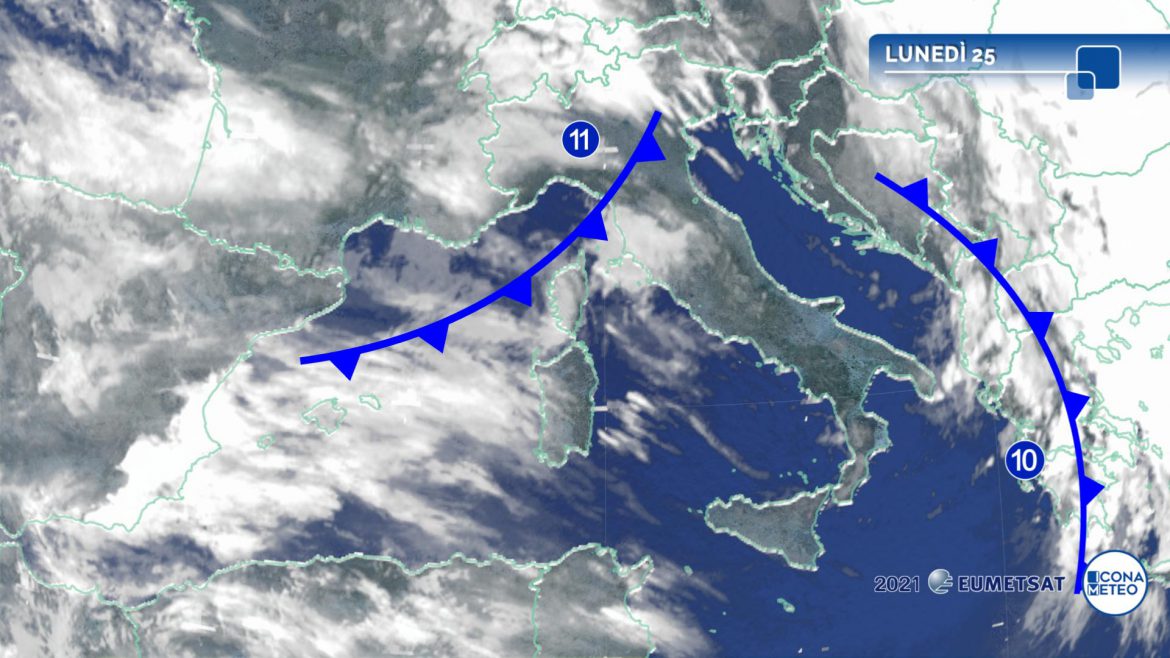 L'undicesima perturbazione del mese sarà seguita da un afflusso di aria più fredda che determinerà un calo termico, soprattutto al Centro-Sud