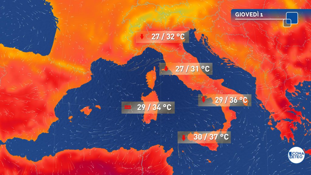Venti: tesi sud occidentali sul mar Ligure; moderati sul medio e alto Tirreno e lungo la dorsale appenninica; foehn nelle valli alpine nordoccidentali. Una debole ventilazione settentrionale attenuerà la calura intensa al Sud e in Sicilia; temperature in lieve calo nelle regioni centrali e al Nordest, in leggero rialzo al Nordovest.