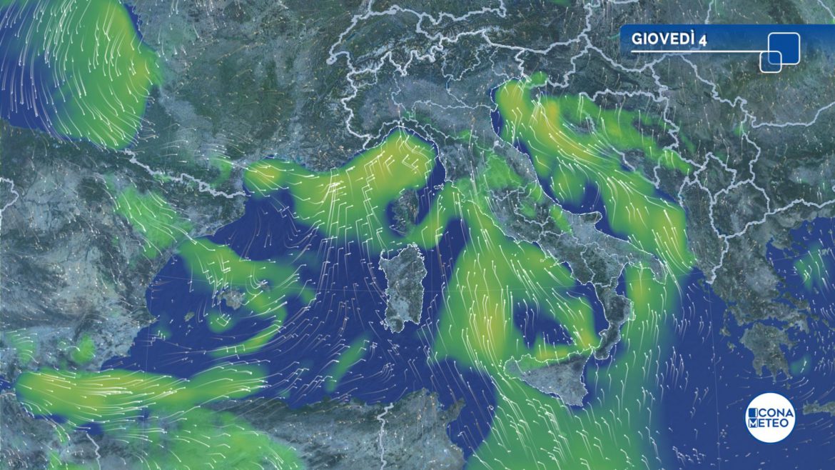 Venti meridionali moderati o forti quasi ovunque, con mari mossi o molto mossi. Possibili forti raffiche nelle aree temporalesche.