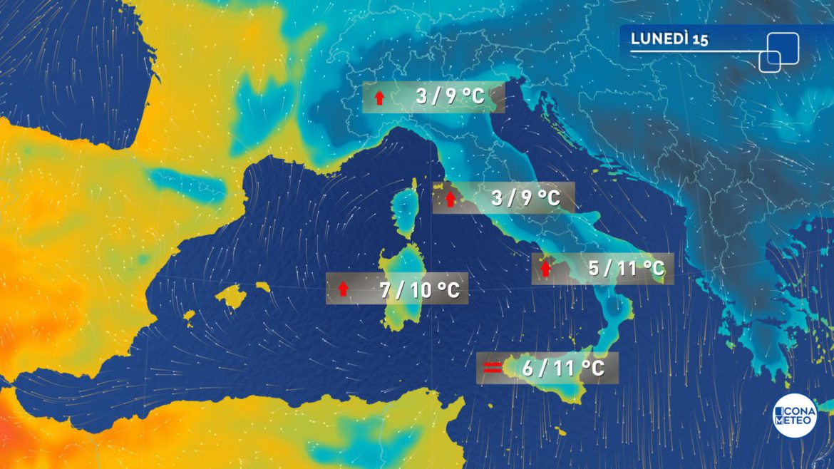 Temperature in lieve rialzo, ma ancora molto basse; massime in generale inferiori alla media, in modo più sensibile sulle regioni centro-meridionali. Venti settentrionali in parziale attenuazione, ancora tesi o forti al Sud, fino a moderati sul medio Adriatico. Altrove venti deboli, ma con tendenza a un rinforzo del Libeccio sul Ligure a fine giornata.