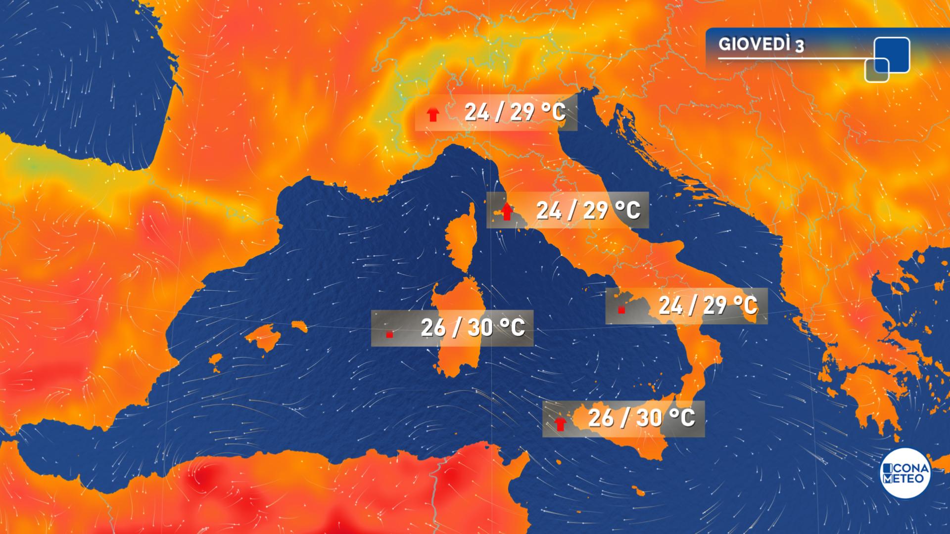 Temperature: minime e massime in generale aumento; clima da inizio estate, con valori che potranno diffusamente superare i 25 gradi con punte fino ai 28-29 gradi.