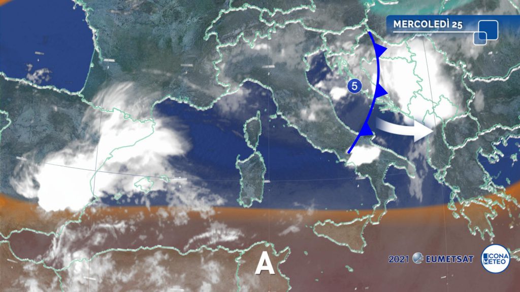 Il fronte instabile che a inizio settimana ha raggiunto il Centro-Nord, oggi coinvolge anche parte del Sud con condizioni di instabilità e un primo calo delle temperature, in particolare in Puglia, Campania e Basilicata. Il caldo intenso, dunque, persiste solo in Calabria e Sicilia dove l’afflusso di aria un po’ più fresca è atteso per domani.
