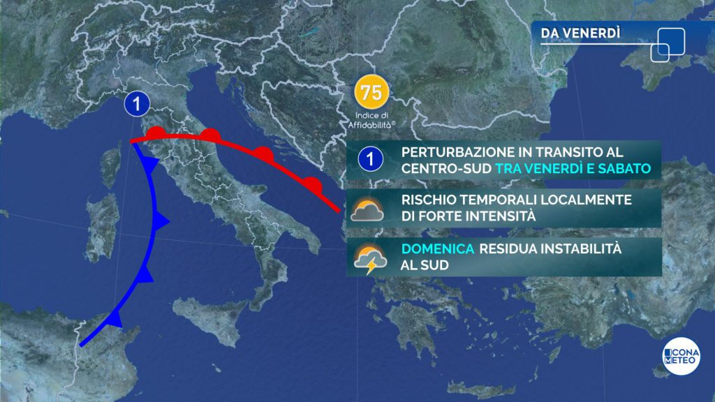 I temporali stanno per fare il loto ritorno sulla scena meteo dell’Italia, dove ancora per oggi prevarranno condizioni di tempo stabile con clima gradevole. Tra domani e sabato, infatti, una nuova perturbazione coinvolgerà le regioni del Centro-Sud. I primi effetti si avranno in Sardegna, dove nella prima parte di domani aumenta la possibilità di rovesci o temporali. Nella giornata di sabato l’instabilità si sposterà sulle regioni del Sud, coinvolgendo marginalmente anche il Centro e la Sicilia. Sulle regioni settentrionali si osserverà un temporaneo aumento dell’instabilità solo sui settori alpini.