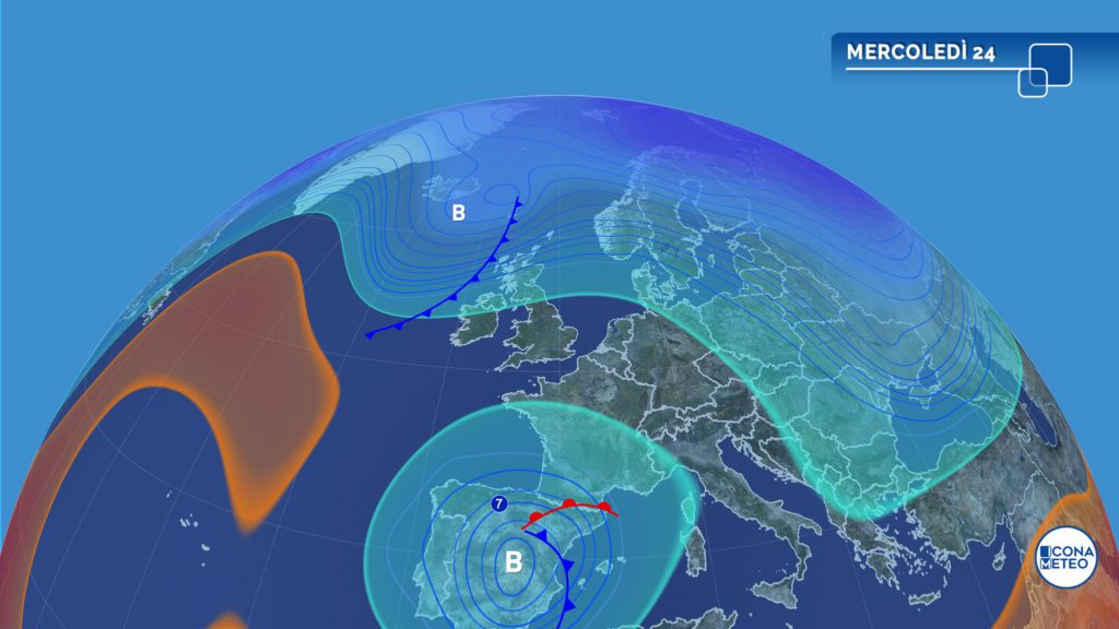 Meteo per domani, mercoledì 24 novembre: in giornata tempo perlopiù soleggiato al Centro-Nord e qualche residua pioggia al Sud e nelle Isole; dalla sera prende forma un’intensa fase di maltempo