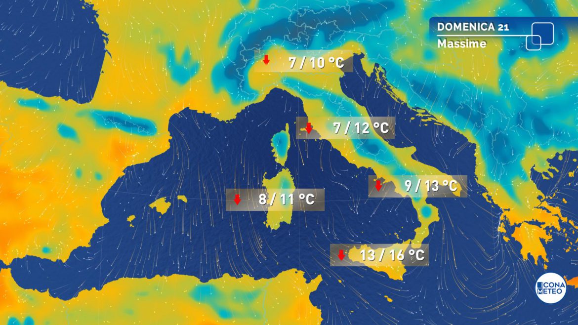 Temperature minime in calo all’estremo Sud, ancora possibili gelate al Nord; temperature massime in rialzo sul Centro-Nord e in Sardegna. Venti di Tramontana da moderati a forti al Centro-Sud, fino a moderati anche sull’alto Adriatico e nelle Alpi centro-orientali. Mari: poco mossi il Ligure e l’alto Adriatico, da mossi a molto mossi gli altri bacini, fino ad agitati il Tirreno sud-occidentale e il Canale di Sicilia.