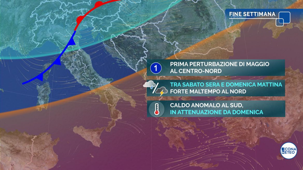 Nel weekend del Primo Maggio l’Italia sarà ancora divisa tra maltempo al Nord e caldo estivo al Sud e in Sicilia, dove si potranno sfiorare punte di 30 gradi. Dopo la perturbazione n.11 del mese, in allontanamento dalle nostre regioni settentrionali, domani un’altra e più intensa perturbazione (n.1 di maggio) raggiungerà dapprima il Nord-Ovest per poi dalla sera estendersi a Nord-Est e Toscana. I fenomeni localmente potranno essere anche intensi.