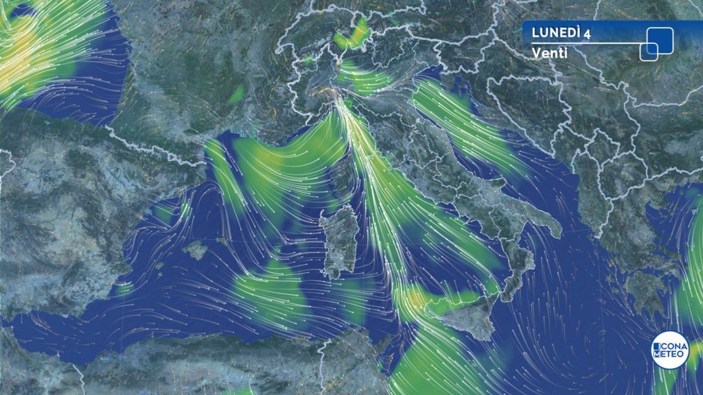 Venti meridionali in intensificazione, con raffiche fino a 50-60 Km/h: prevalenza dello Scirocco sul Tirreno e sull’Adriatico, del Libeccio su Mare e Canale di Sardegna. Forti raffiche di vento nelle aree temporalesche.