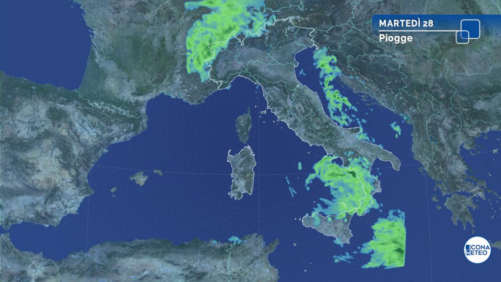 Meteo per domani, martedì 28 dicembre: ancora qualche pioggia all’estremo Sud e in Sicilia; precipitazioni nei settori alpini