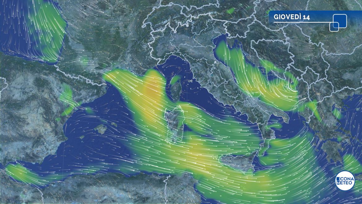 Temperature minime in rialzo al Nord-Ovest e in Sicilia, in calo sulla Sardegna; massime in generale diminuzione con valori sotto la media al Centro-Sud. Venti settentrionali ancora moderati al Sud e sulle Isole, in attenuazione altrove. Mari: molto mossi o localmente agitati Mare e Canale di Sardegna, Canale di Sicilia e basso Ionio; mossi Ligure occidentale, basso Tirreno e alto Ionio; poco mossi o localmente mossi i restati mari.