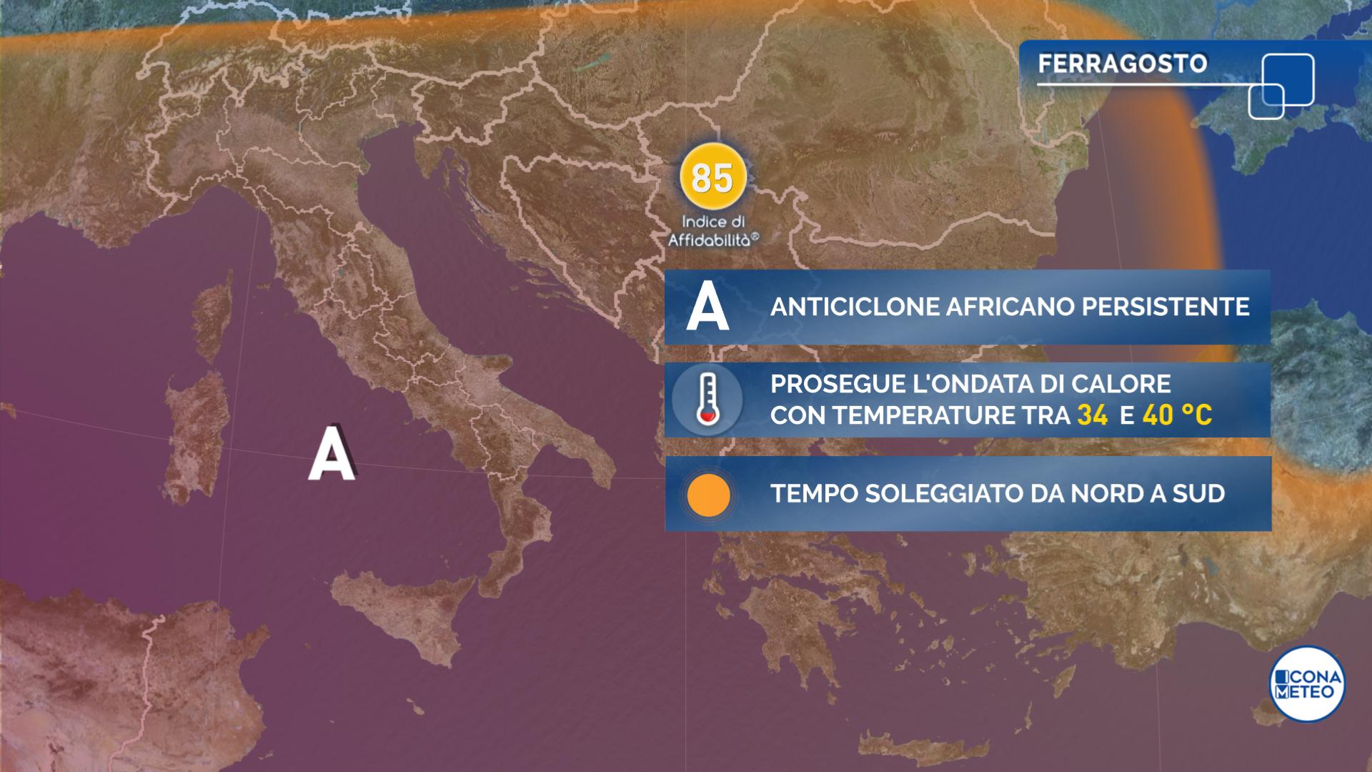 Clima estremamente caldo e in buona parte anche afoso. Probabile picco della calura per il Nord. Valori massimi in generale fra 33 e 38 gradi, ma con picchi di 39-41 gradi nella bassa pianura padana, zone interne del Centro-Sud e della Sardegna. Caldo intenso e afoso anche di notte con minime in gran parte oltre i 22 gradi e localmente non inferiori a 26-28 gradi al Sud e Sicilia. Venti deboli, a prevalente regime di brezza, mari calmi o poco mossi.