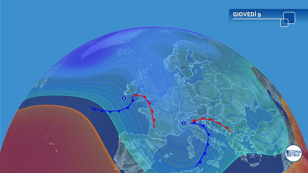 Il secondo impulso perturbato (n.4), raggiungerà l’Italia nella giornata di venerdì con rischio di ulteriori nevicate a quote molto basse in alcuni settori del Nord e dell’Appenino settentrionale. La circolazione ciclonica ad essa collegata, nella giornata di sabato, si posizionerà a ridosso delle regioni centrali determinando condizioni di maltempo diffuso sulle regioni peninsulari e sulle Isole nonché venti burrascosi e aria fredda anche al Sud.