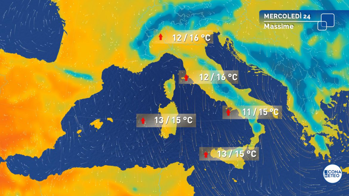 Temperature massime in lieve rialzo in Sardegna, stazionarie o in lieve calo altrove. Insistono i venti settentrionali moderati o localmente forti al Centro-Sud e sulla Sicilia; venti deboli al Nord, venti in indebolimento sulla Sardegna centro-occidentale. Mari: poco mossi il Ligure e l’estremo settentrionale dell’Adriatico; mossi o molto mossi tutti gli altri, fino a localmente agitati il Tirreno sud-occidentale e il Canale di Sicilia.