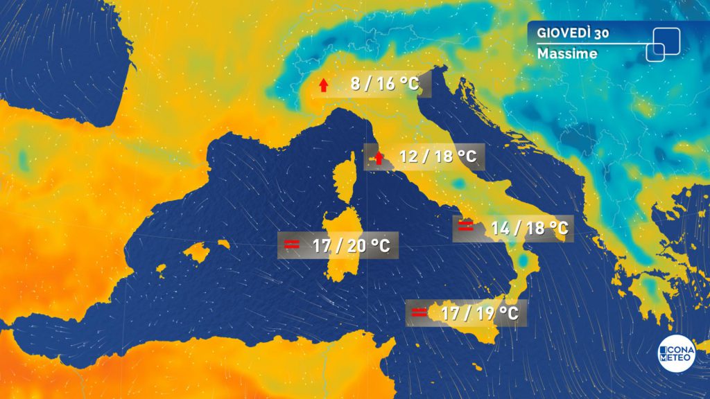 Temperature massime in aumento di qualche grado su Alpi, Piemonte, Liguria, Emilia, regioni centrali e Sicilia; valori prossimi ai 20 gradi sulle isole maggiori.