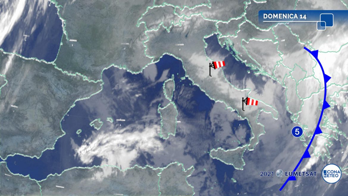 Temperature in ulteriore calo al Sud e sulle Isole; in rialzo altrove, specie sul Nord-Ovest. Venti: in prevalenza deboli al Nord; da moderati a forti sul resto del Paese, per lo più nord-orientali. Mari: poco mossi i bacini settentrionali; molto mossi tutti gli altri.