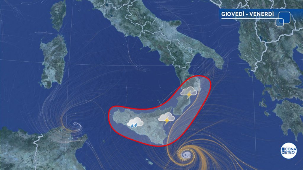 Meteo per domani, giovedì 28 ottobre: il vortice ciclonico si riavvicina alla Sicilia, con rischio di nuove precipitazioni sull’Isola e in Calabria. Forti venti tra il mare Ionio meridionale e il Canale di Sicilia; temporali in Sardegna