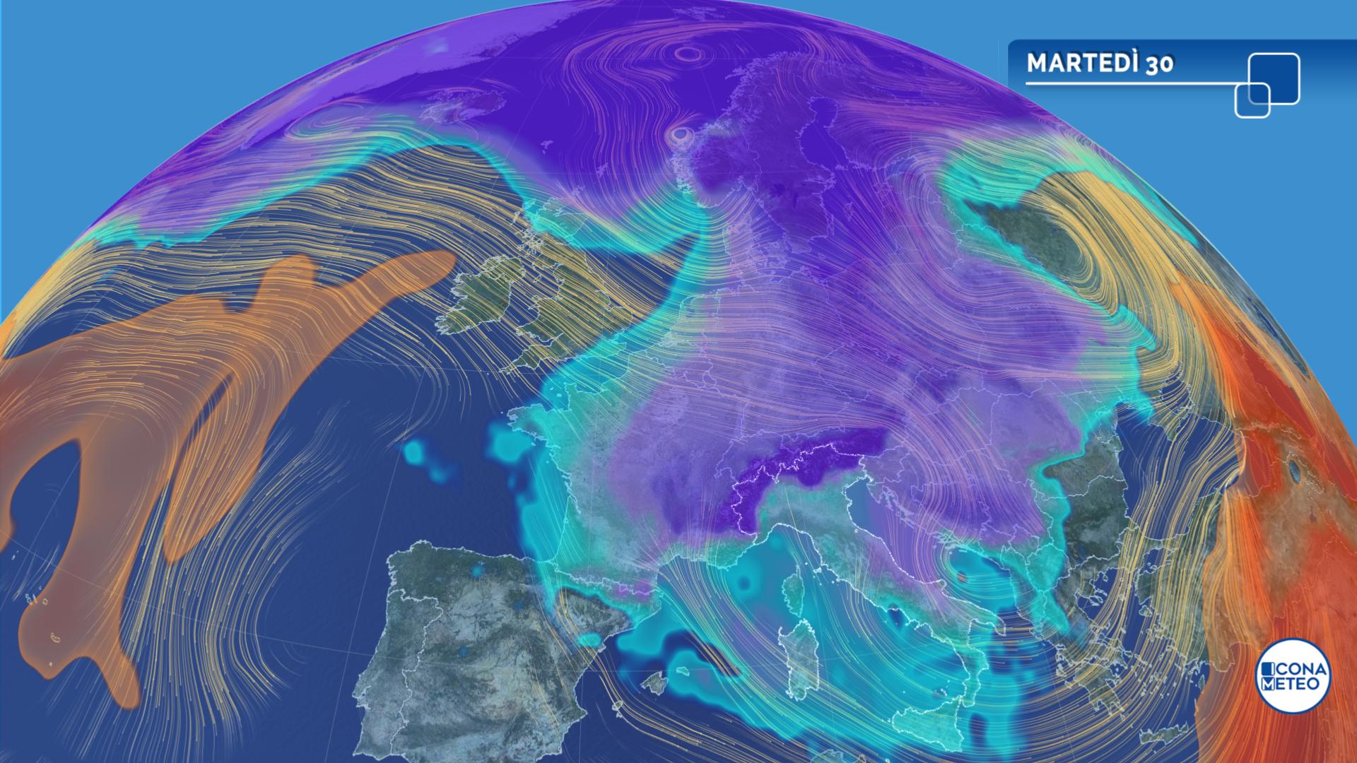 Temperature: per lo più in calo nelle minime, con gelate anche in pianura al Nord; massime pomeridiane in ulteriore lieve diminuzione al Sud e sulla Sicilia, senza grandi variazioni altrove, ovunque ancora inferiori alla norma. Clima invernale.