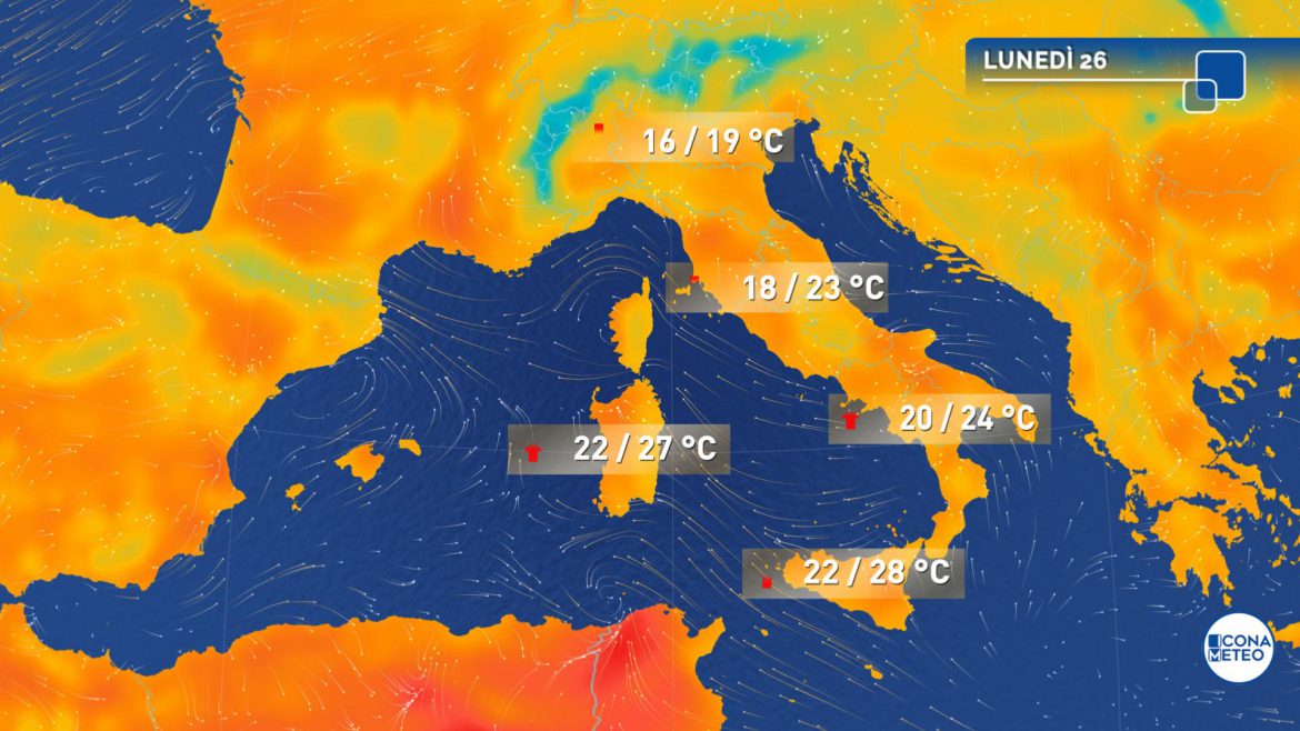Temperature: massime in calo di 4-6 gradi al Nord; in leggera diminuzione anche sulla Toscana, in ulteriore aumento al Sud, con punte anche oltre i 25 gradi nei settori occidentali delle Isole e nel nord della Sicilia.