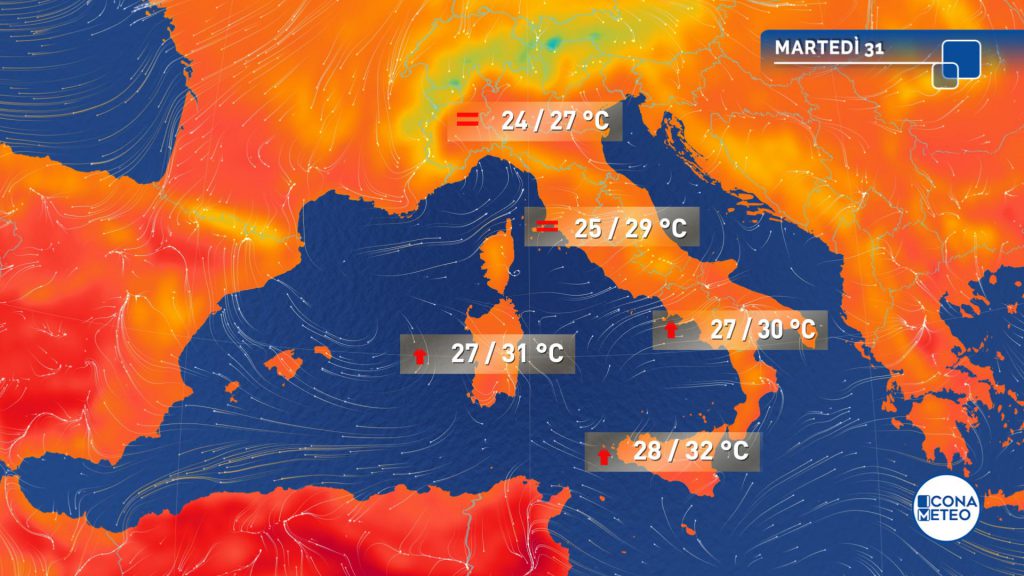 Temperature: minime all’alba per lo più in lieve aumento; massime in leggero rialzo al Sud e sulle Isole. Caldo ovunque nella norma, con valori generalmente compresi tra 24 e 31 gradi, poco oltre solo in Sicilia.