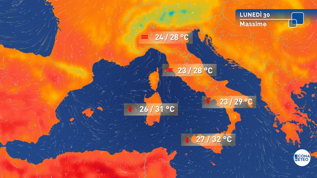 Temperature: minime all’alba per lo più in lieve aumento; massime in leggero rialzo al Sud e sulle Isole. Caldo ovunque nella norma, con valori generalmente compresi tra 24 e 31 gradi, poco oltre solo in Sicilia.
