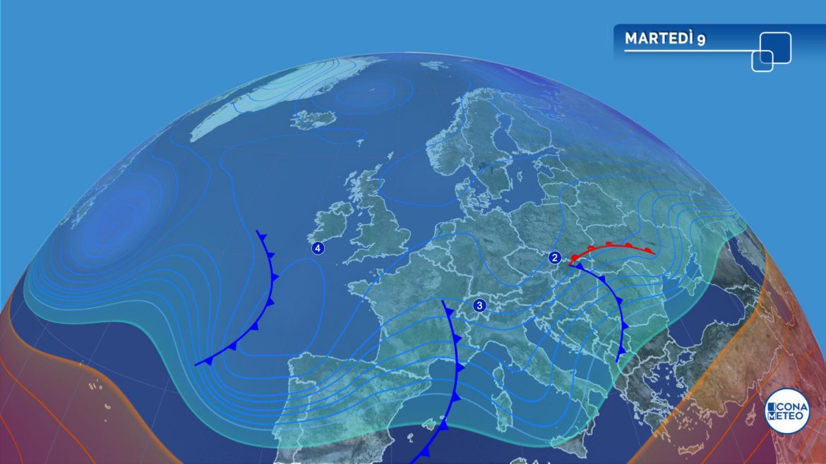 Al Nord le precipitazioni cesseranno prima dell’alba e a metà giornata si osserveranno schiarite temporaneamente anche ampie. In serata, però, il tempo peggiorerà al Nord-Ovest: le prime deboli precipitazioni sono attese tra Liguria, Piemonte e Val d’Aosta, nevose intorno ai 1200 metri.