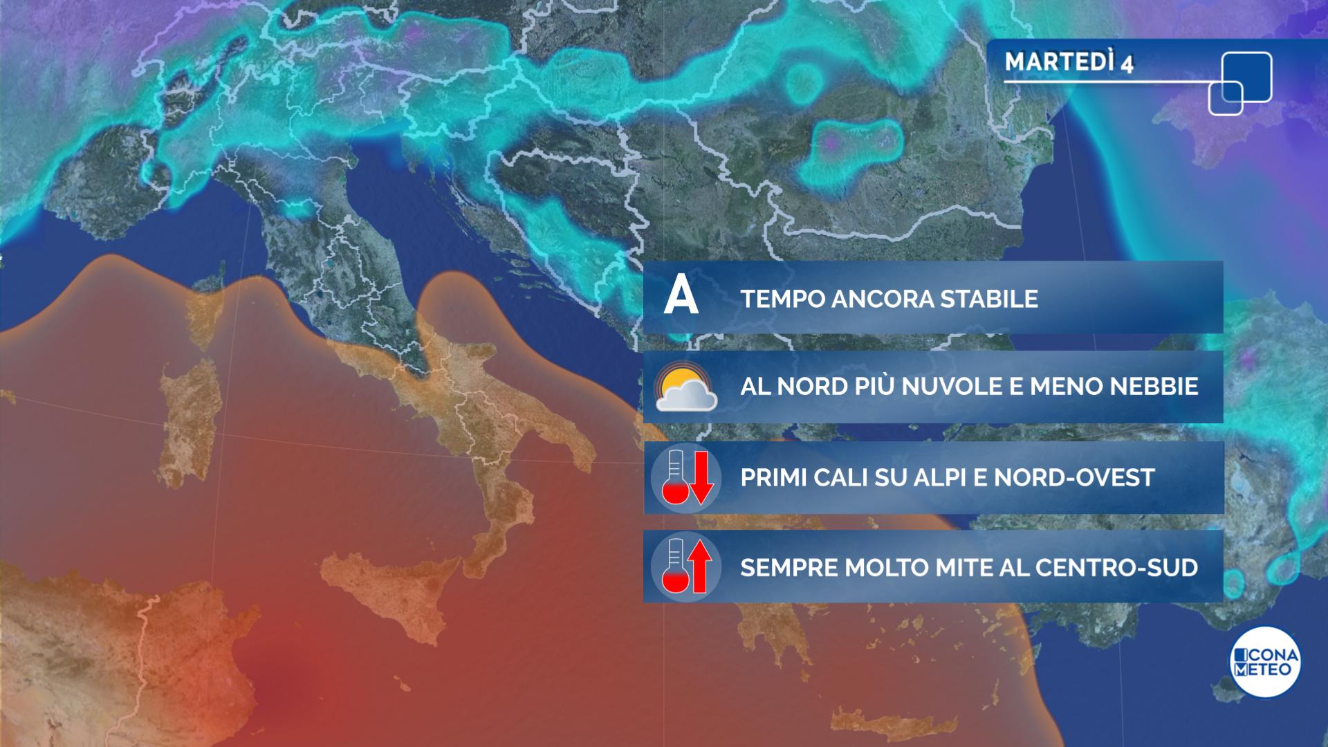 Temperature minime in lieve aumento al Centro-Nord e generalmente sopra lo zero; massime in lieve calo al Nord-Ovest e nel settore alpino, in lieve aumento nelle zone più soleggiate del Centro Sud. Clima ancora mite per la stagione con punte di 18-20 gradi su Calabria e Isole.