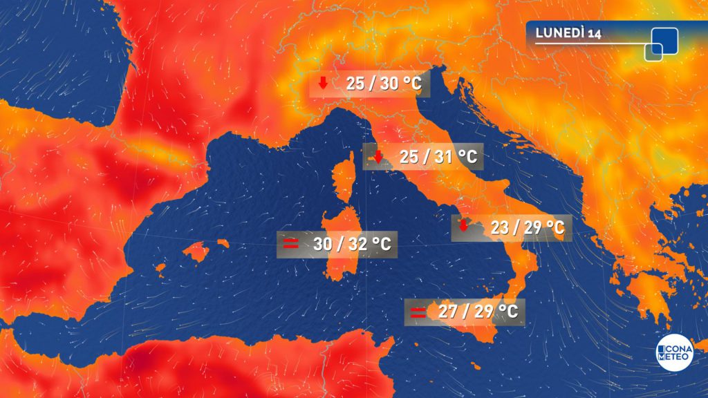Temperature: massime in lieve rialzo sulle regioni di Nordest e su quelle adriatiche; stabili o in lieve calo altrove. Valori nella norma o lievemente sotto sul medio-alto Adriatico e al Sud, per lo più compresi tra 25 e 28 gradi; valori leggermente al di sopra nel resto d’Italia con valori in gran parte compresi tra 28 e punte di 31-32 gradi.