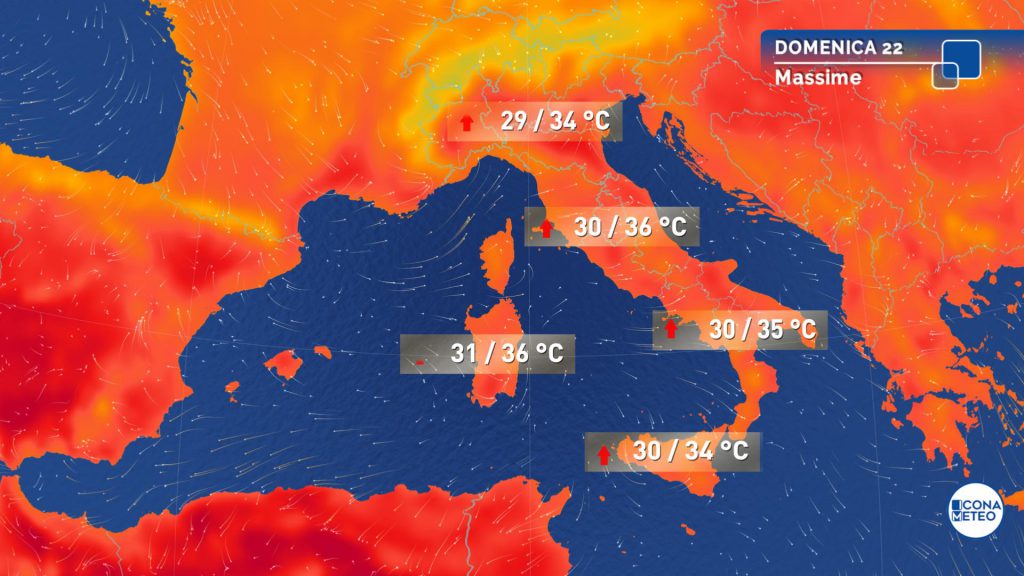 Temperature: per lo più in aumento, più sensibile sulle regioni centrali adriatiche. Valori generalmente compresi tra 29 e 33 gradi, con massime intorno ai 35 gradi nelle aree interne peninsulari e della Sardegna.
