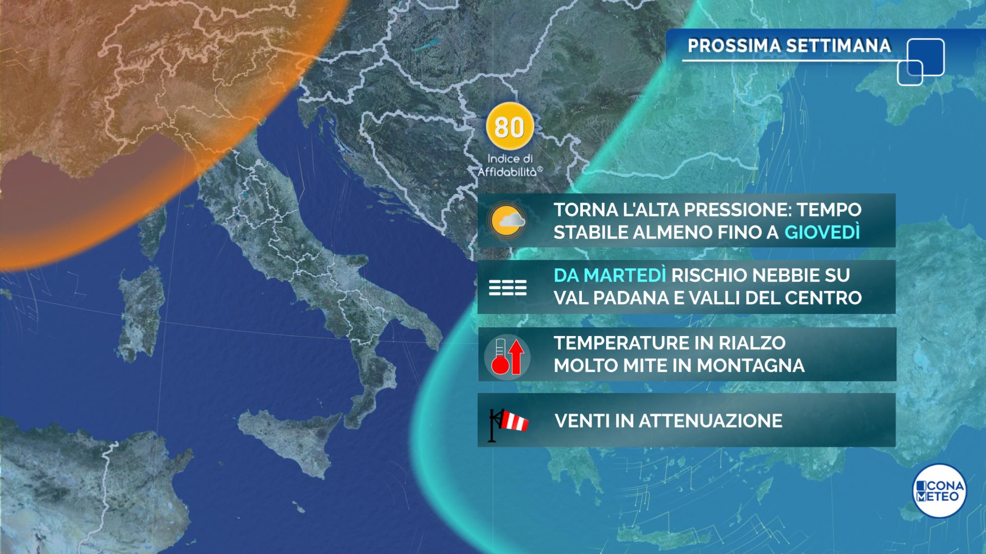 Da domani si profila poi una fase meteo più stabile, che nella settimana prenatalizia determinerà bel tempo in gran parte del Paese ma, specie nelle zone di pianura, provocherà un aumento del rischio di nebbia e, purtroppo, potrà anche favorire l’accumulo di sostanze inquinanti.