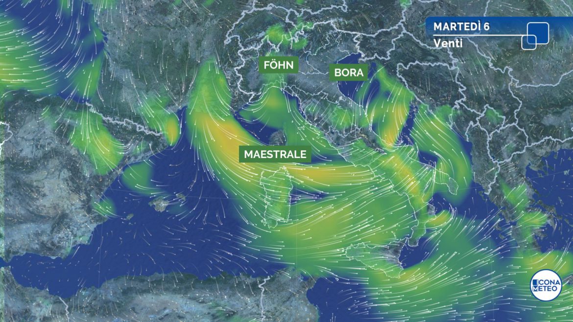 Sarà una giornata molto ventosa, con venti intensi di Bora sull’alto e sul medio Adriatico, di Maestrale su Corsica e Sardegna, di Tramontana in Liguria. Sono attese raffiche di burrasca che potranno arrivare intorno agli 80 km orari, e in Sardegna si potranno registrare anche violente raffiche di tempesta fino a circa 100 km orari.