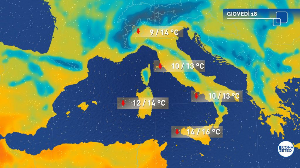 Nel pomeriggio ancora piogge in Calabria e sul nord della Sicilia; rovesci e possibili temporali sulla Sardegna, specie settore centro orientale, con neve fino a 900-1000 metri. Al Centro ancora qualche rovescio sul settore appenninico, nevoso sopra 600 metri circa; brevi rovesci o temporali isolati su Toscana occidentale, alto Lazio.